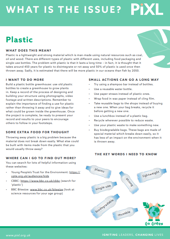 Our Go Green Stimulus Sheets provide an opportunity for pupils to explore some of the important issues relating to sustainability and climate change including litter, use of plastics and fossil fuels. Each sheet presents a summary of the issue, ways that children and young people can help, pertinent vocabulary to support them in discussing the issue and links to useful websites to help them to find out more.